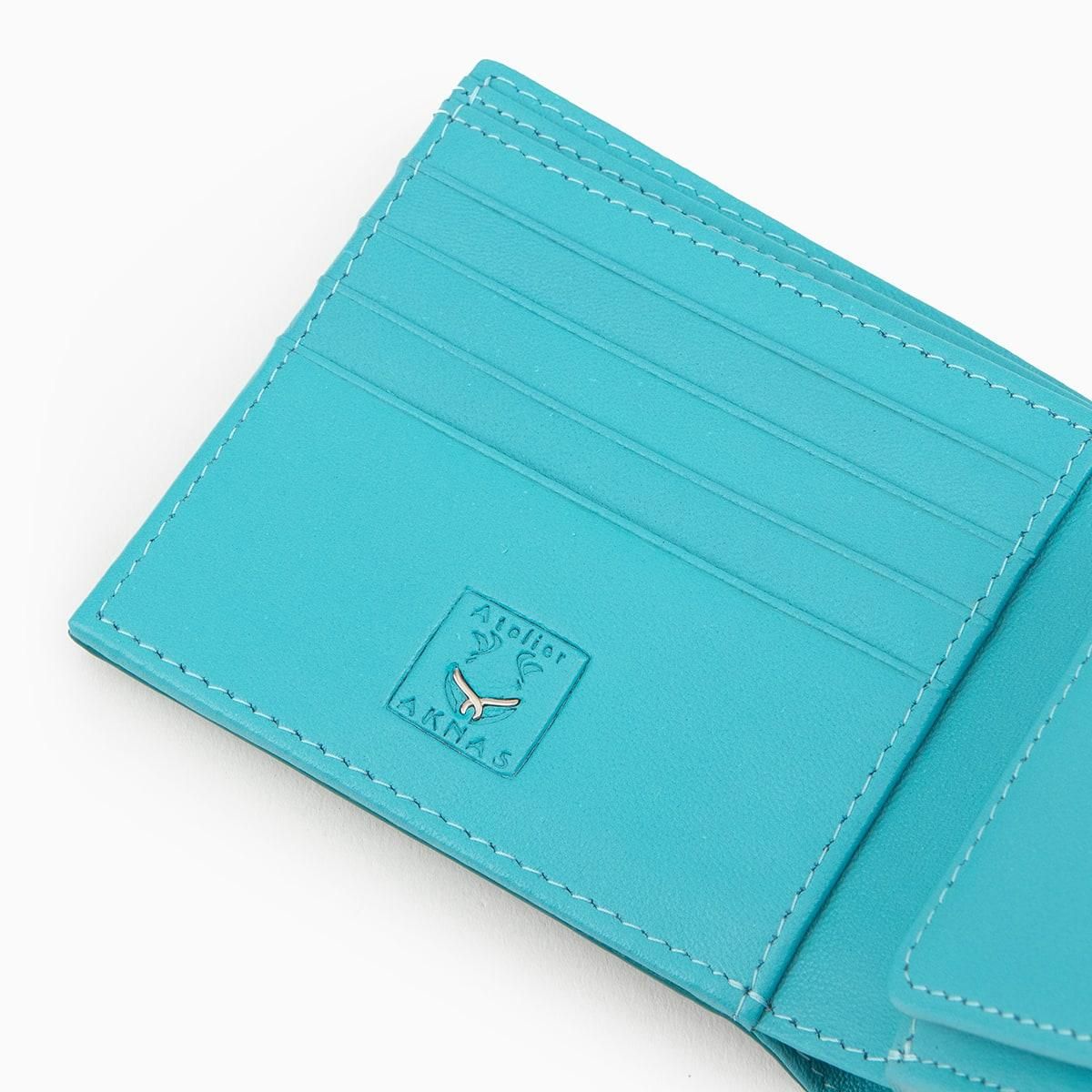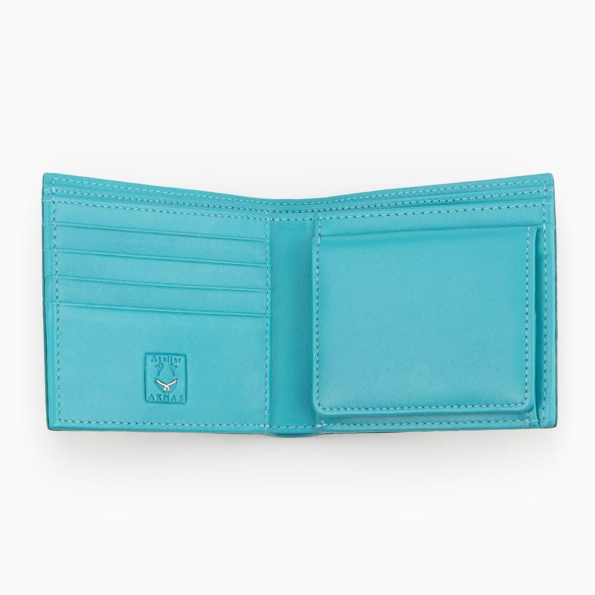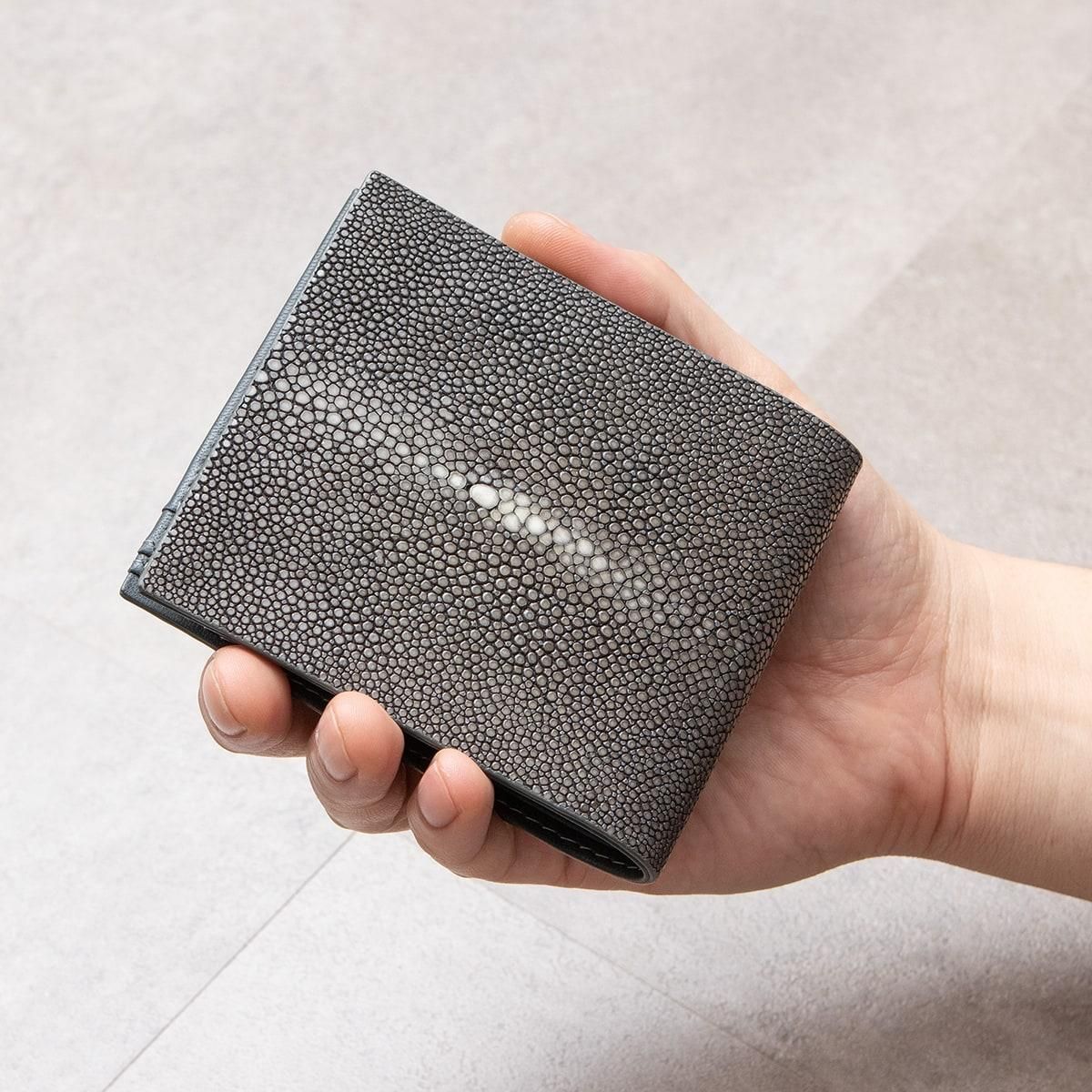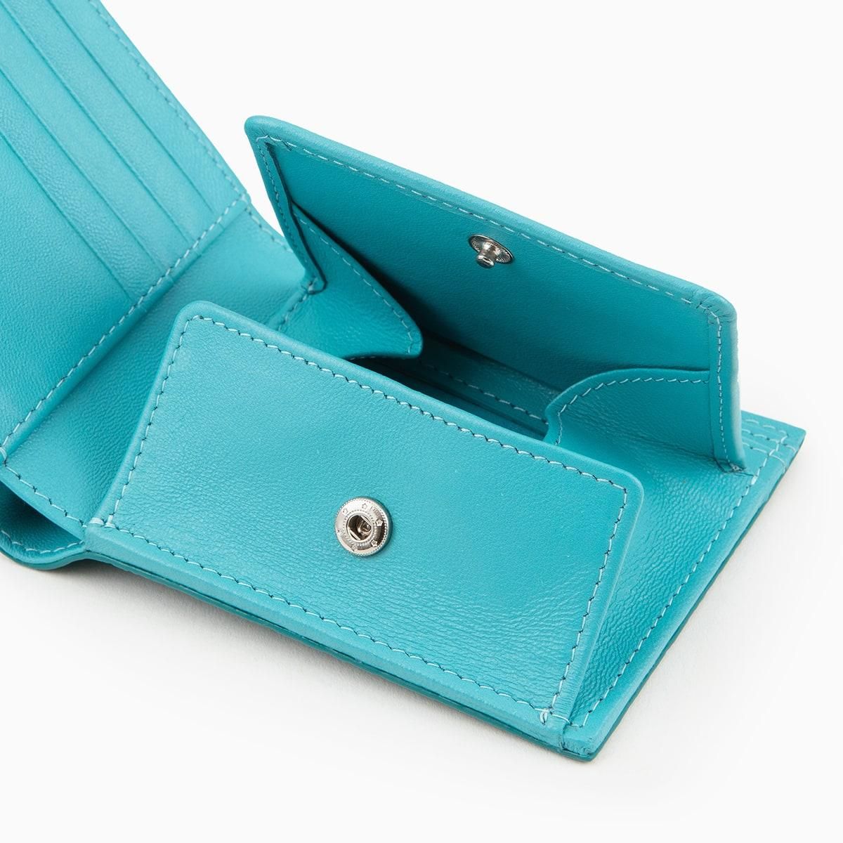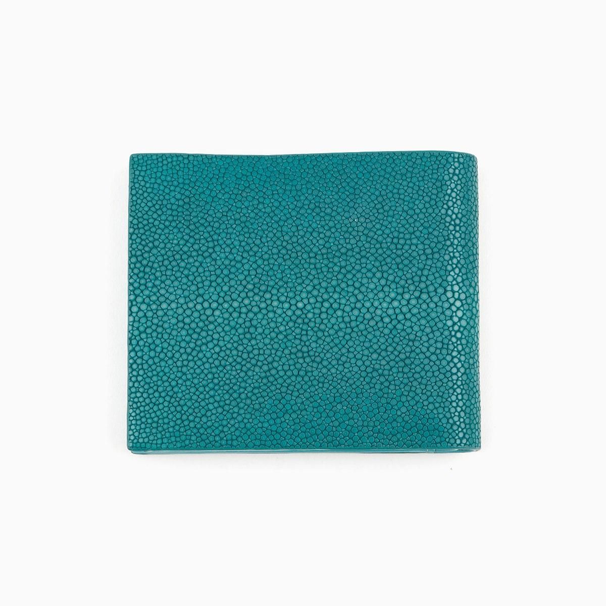 美しい海水のように爽やかな青緑色に輝くターコイズのエイ革「ガルーシャ」を、外装としてセレクトした二つ折り財布。自己表現をしたいクリエイターなどに好まれる色合いが、宝石を散りばめたような豪華な光沢と、「ガルーシャ」のシンボルでもあるスターマーク(天眼)をまとうことで、さらなる感性を刺激していく。古来より縁起が良い革として重宝されてきた稀有な素材と、繁栄・成功など将来への希望の意味を持つ色彩との融合が、この上ない幸福感を創出。札入れ2つ・カード段4つを装備するとともに、高いサイドマチで包み込むBOX形状のボタン付き小銭入れも備えたサイズ感を超える利便性が、普段使いをより楽しくしてくれる。