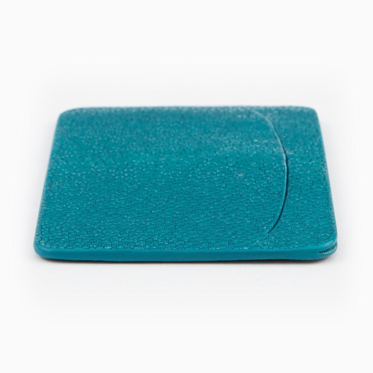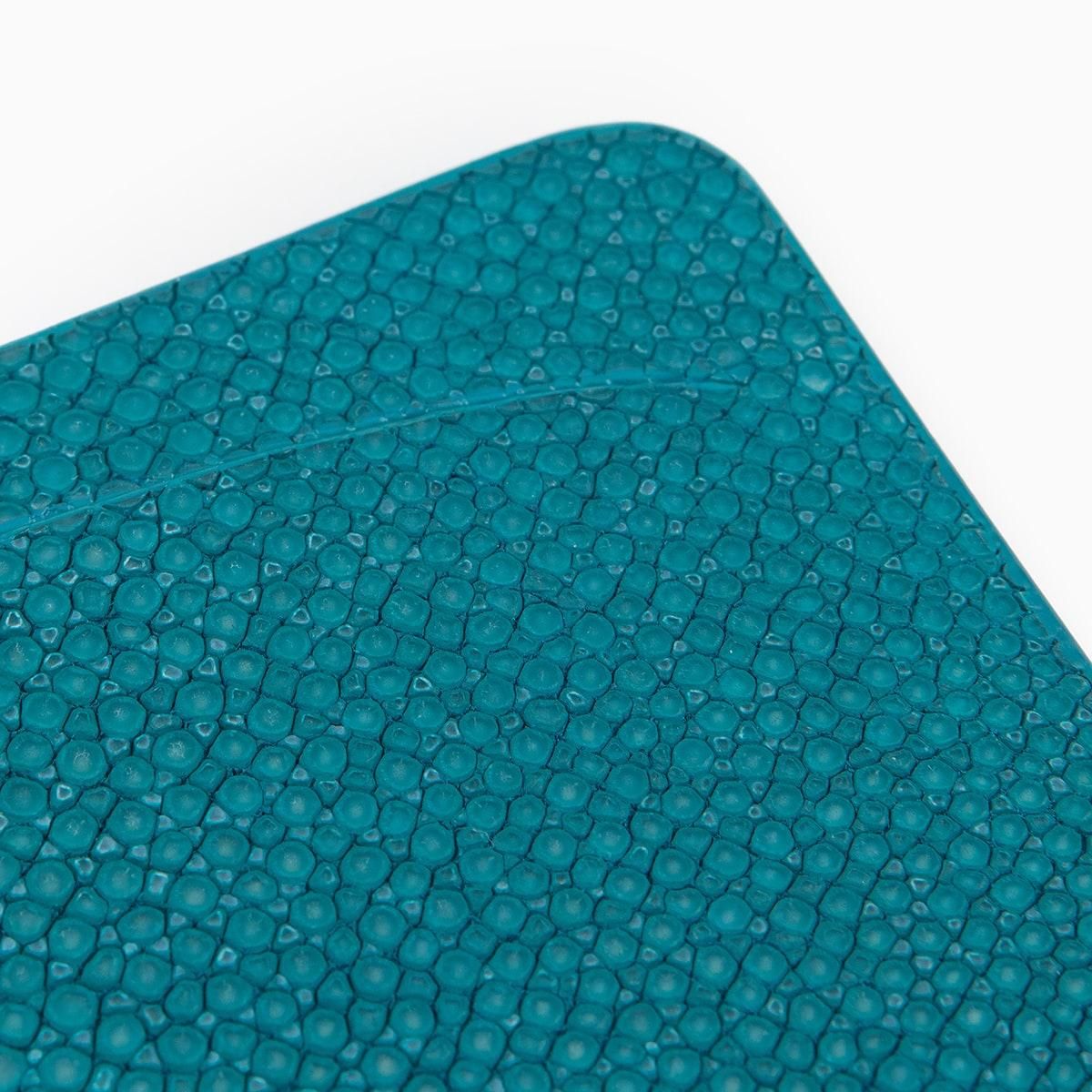 美しい海水のように爽やかな青緑色に輝くターコイズのエイ革「ガルーシャ」を、外装としてセレクトした単パスケース。自己表現をしたいクリエイターなどに好まれる色合いが、宝石を散りばめたような豪華な光沢をまとうことで、さらなる感性を刺激していく。古来より縁起が良い革として重宝されてきた稀有な素材と、繁栄・成功など将来への希望の意味を持つ色彩との融合が、この上ない幸福感を創出。究極的に薄くスリムなフォルムで、理想的な2枚のカードの持ち歩きにも適したシンプルなデザインには、フレンチならではのモノ作りへのこだわりが込められている。
