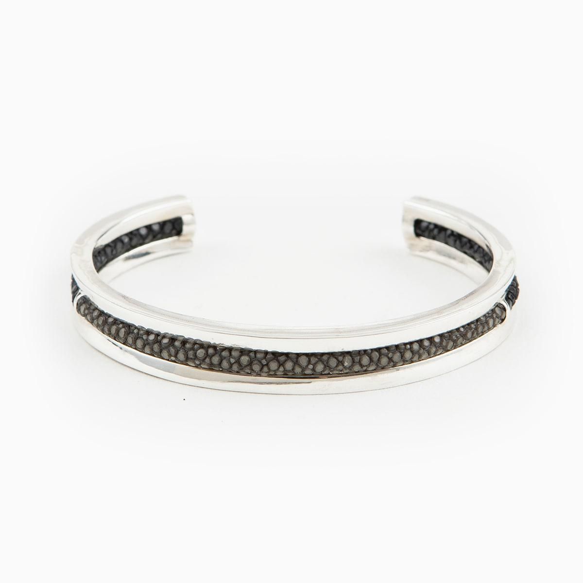 キャビアのような輝きのノワール(黒)と、金属的な色彩のスティールのエイ革「ガルーシャ」を組み合わせて、フレームに沿うようにセンターに施したスマートライン バングル『ロハン』。ダークな2つの色合いが、宝石を散りばめたような光沢をまとうことで、エレガントな高級感と重厚感を漂わせていく。熟練の職人が、無垢のスターリングシルバー925をハンドメイドで加工した曲線のフォルムと、美しく融合する「ガルーシャ」の他にはない風合いが、ジュエリーとしての愛着をさらに高めてくれる。