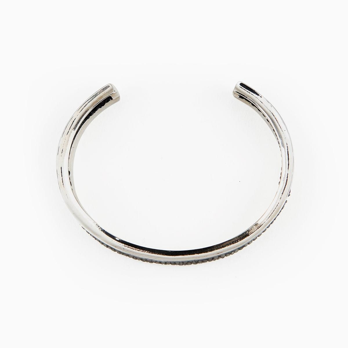 熟練の職人が、丸く曲げたシルバーフレームの中抜き部分に、曲線に沿わせながら丁寧に「ガルーシャ」を組み込み、エレガントな上質感を創出。「ガルーシャ」の細やかに輝く光と、ツヤ肌のメタルフレームが、見事なまでに美しく融合しています。さらに、「ガルーシャ」の重厚感を表現しつつ、見た目よりもシルバーを軽量化させているので、腕に装着しても見た目ほどの重さは感じません。