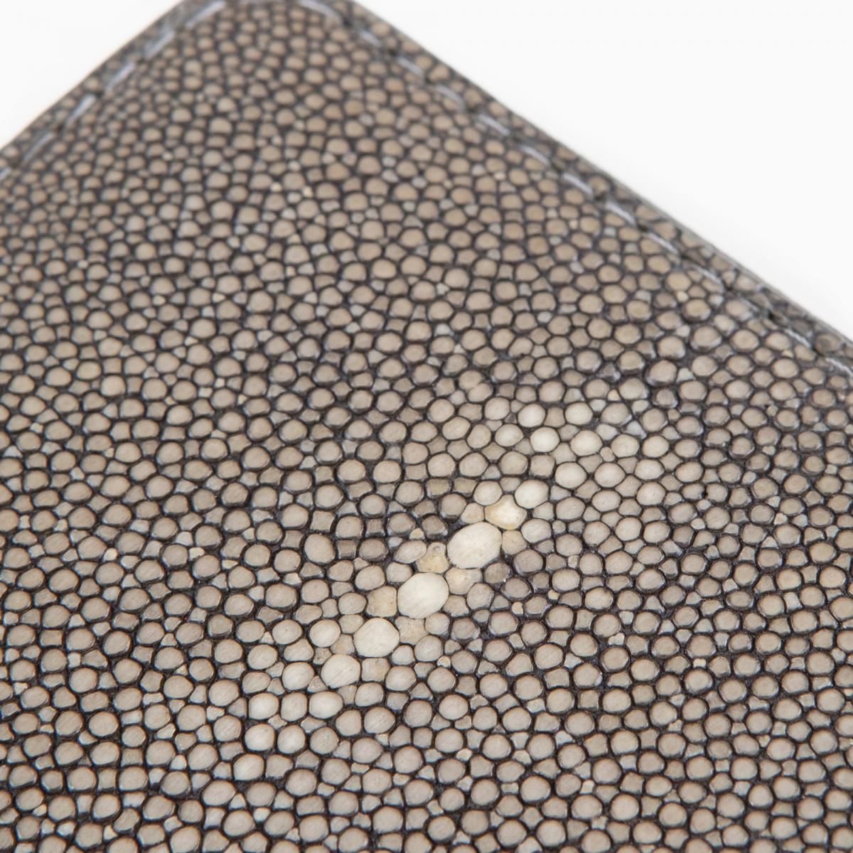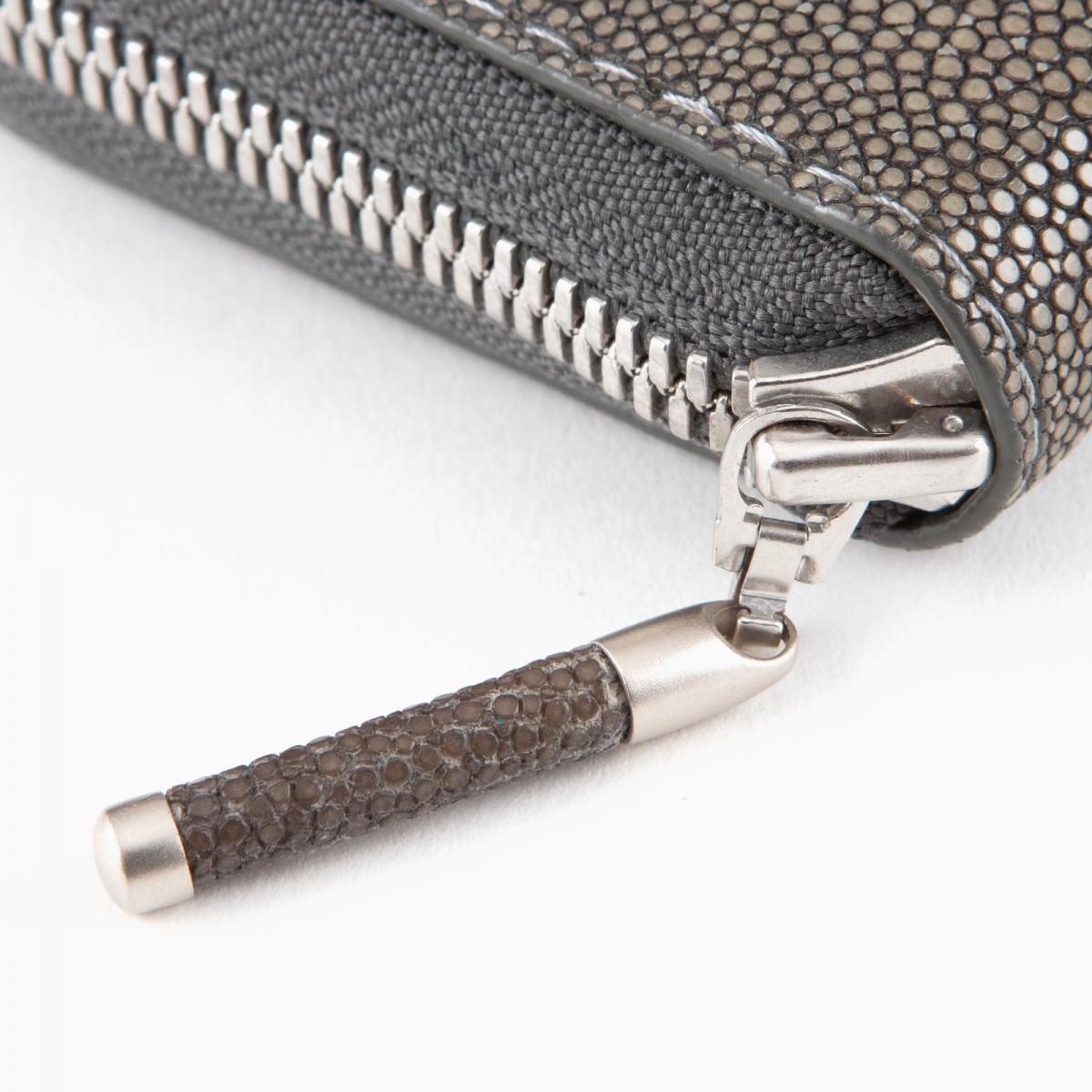 昔から“ラッキーフィッシュ(幸福の魚)”とも呼ばれているエイ革「ガルーシャ」は、動物性とミネラル性の成分を併せ持つユニークな素材。クロコダイル・リザード・パイソン・オーストリッチなど、固有の特長を有するエキゾチックレザーに分類されていて、美しく覆っているガラスビーズを散りばめたような小さな鱗と、地中海の潮風を指先で感じるような冷んやりとした感触が魅力です。人間の歯と同じリン酸カルシウムでできており、他の革と比べても圧倒的に堅固で扱いにくい反面、“100年モノ”と言われるくらい強度と耐久性に優れていることでも有名。内装には、肌触りが柔らかく耐摩擦性に優れた軽量革「イタリアンゴートレザー」(イタリア産・山羊革)を採用し、個性的な凹凸のシボと独特な毛穴の形状が特長的で、薄くても丈夫で型崩れもしにくい特性があります。